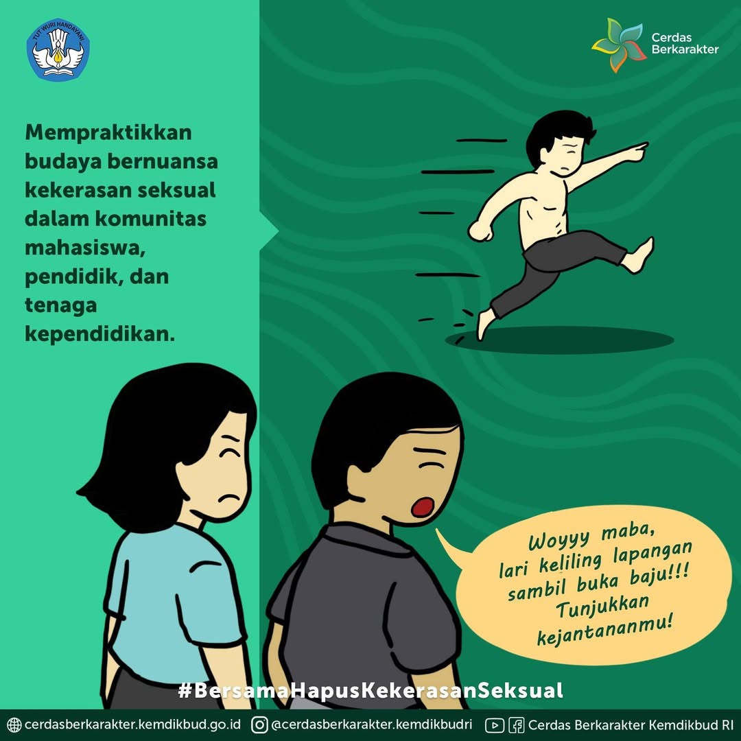 “Kekerasan Seksual adalah setiap perbuatan merendahkan, menghina, melecehkan, dan/atau menyerang tubuh, dan/atau fungsi reproduksi seseorang, karena ketimpangan relasi kuasa dan/atau gender, yang berakibat atau dapat berakibat penderitaan psikis dan/atau fisik termasuk yang mengganggu kesehatan reproduksi seseorang dan hilang kesempatan melaksanakan pendidikan tinggi dengan aman dan optimal.”